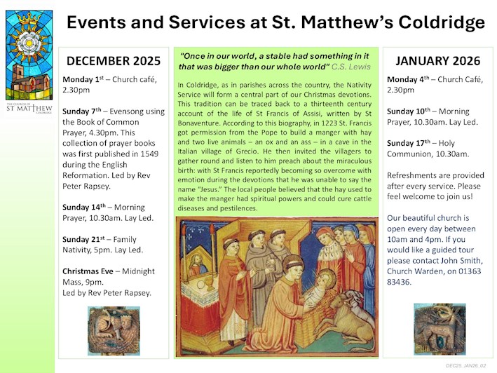 Click here to download a PDF copy of the December 2025/January 2026 - Events and Services at St. Matthew's Coldridge.
